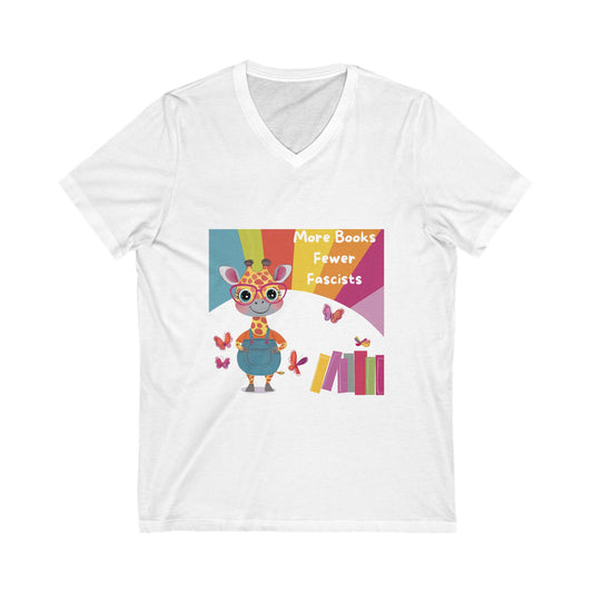 Kawaii Giraffe Reading Anti-Fascist V-Neck T-Shirt | Cute Activist Tee