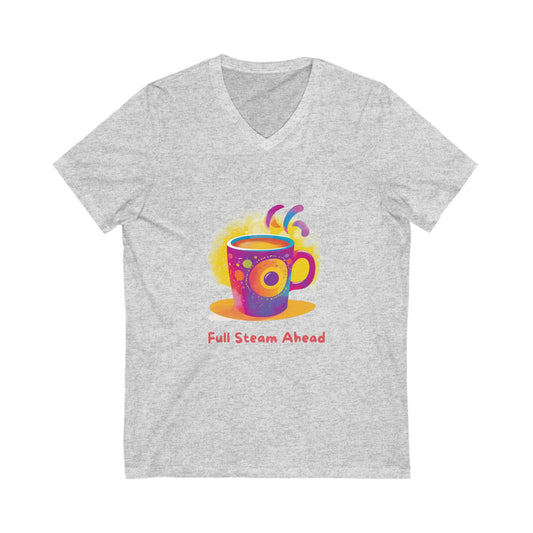 Full Steam Ahead Coffee V-Neck T-Shirt | Kawaii Motivational Tee | Rainbow Cup Design