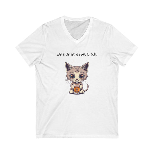 Dawn Rider Cat V-Neck Tee | Coffee Loving Kitten | Funny Cat Shirt