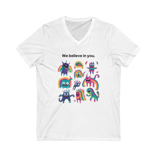 Rainbow Monster Squad V-Neck Tee | Kawaii Empowerment Design | Inclusive Unisex T-Shirt