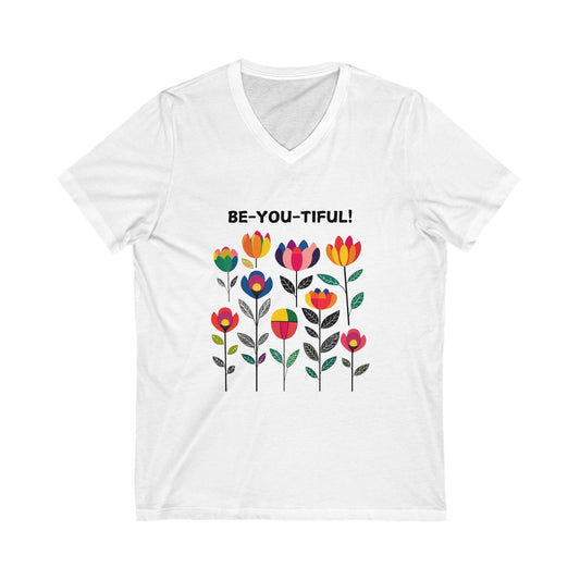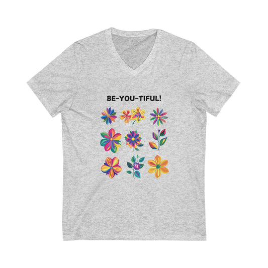 BE-YOU-TIFUL Rainbow Floral V-Neck T-Shirt | Empowerment Gift | Pride Inspired Unisex Tee