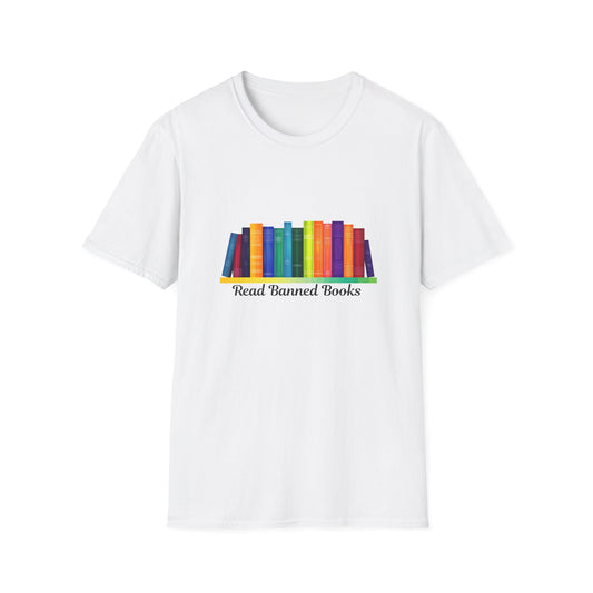 Read Banned Books Rainbow Bookshelf T-Shirt | Literary Activism Tee