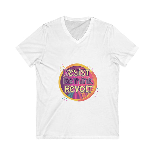 Resist Rethink Revolt V-Neck T-Shirt | Retro Activist Circle Design | Progressive Unisex Tee