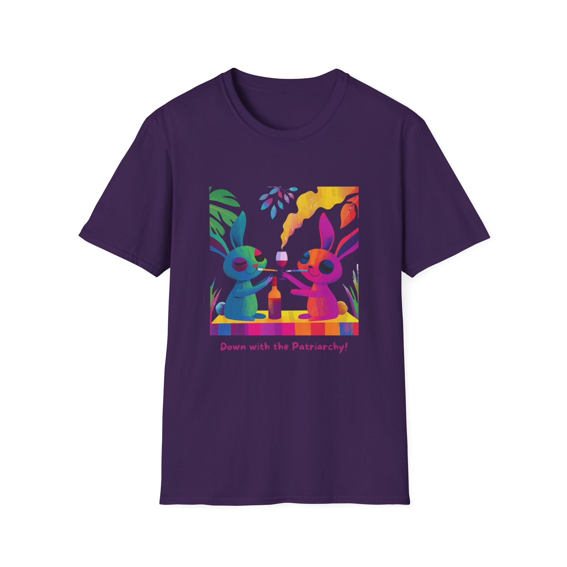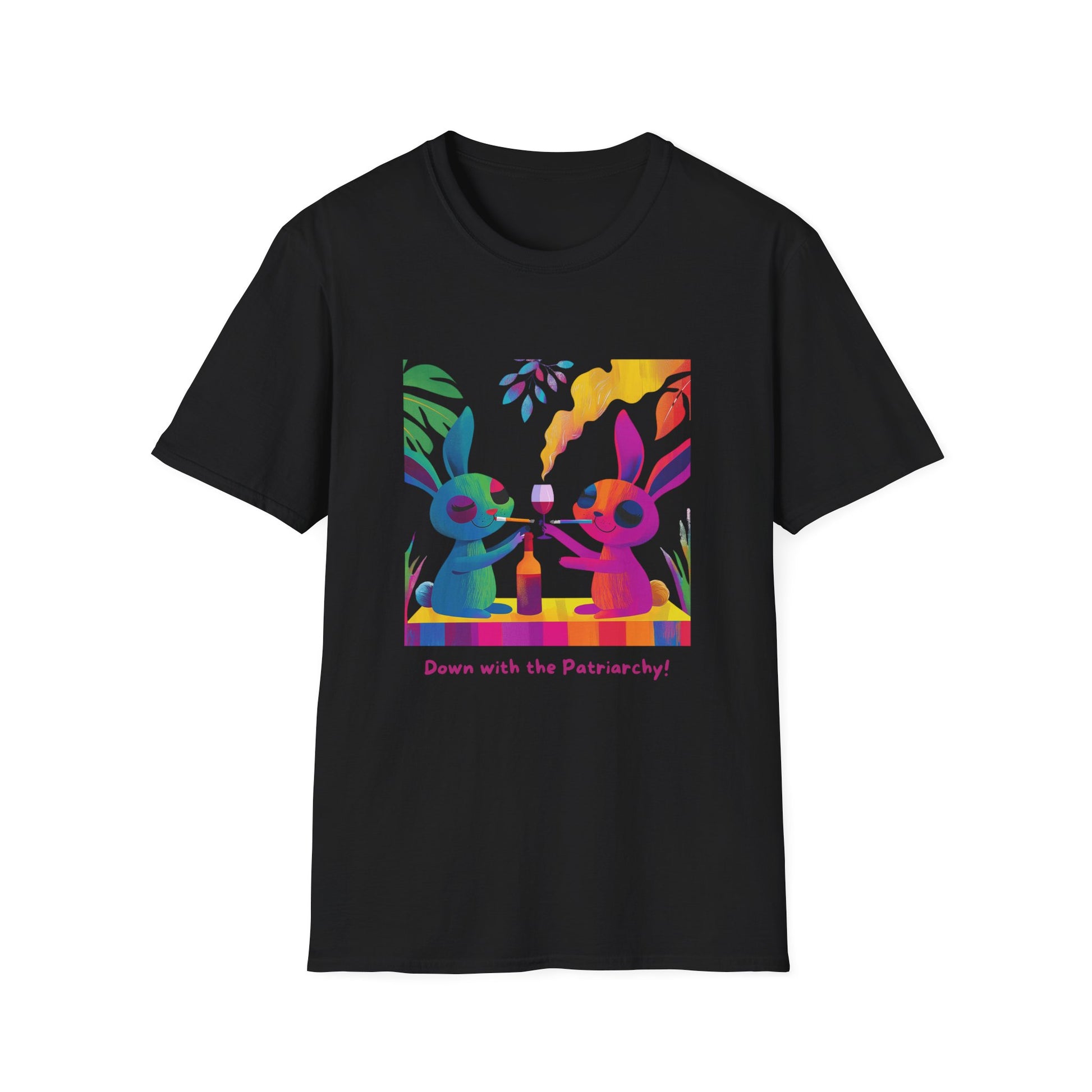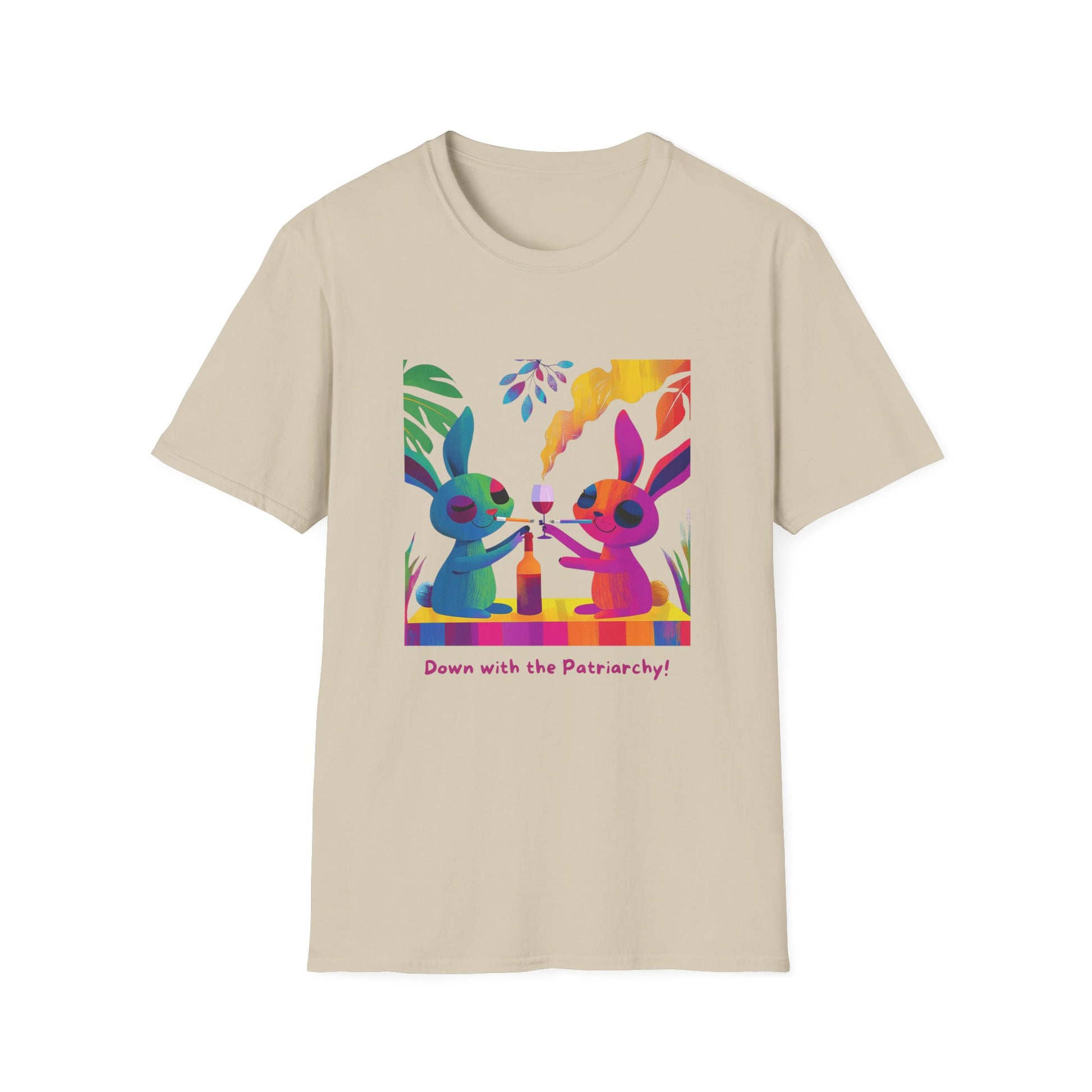 Make a bold statement with our "Down With The Patriarchy" Kawaii Bunnies T-Shirt! This vibrant design features two adorable rainbow bunnies sharing a drink, combining cute aesthetics with powerful feminist messaging.